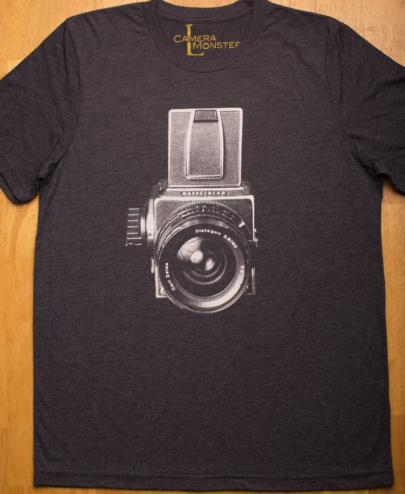 A Camera Monster original design which has been printed using a non-destructive bleaching process called discharge printing, so there is no actual ink on the shirt. Soft to the touch and will never fade or crack, and does not have a plastic-like feel. All of our designs are hand printed in Brooklyn by the artist on ultra-high quality 50/50 blended shirts. These shirts are exceptionally soft, very breathable, and wick moisture away significantly better than straight cotton shirts. This shirt is available in dark charcoal grey. Also, each garment is laundered and shrunken down before shipping, so you don't have to make any guesses as to the final size after laundering. If you haven’t done so already, pop on over to the ‘Details’ page and take a quick look at how I make these, learn a bit about the materials, and read my bio.